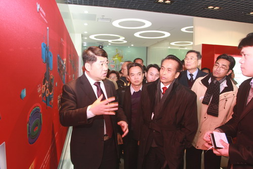 In the informatization exhibition hall, Mr. Zhang Yan introduces the honorary awards, company layout and achievements of tire RFID wafer research and development to Mr. Supachai Phosu and his retinue.